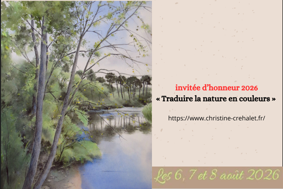 Invitée d’honneur du salon 2026, animera un stage les 6, 7 et 8 août 2026 avec pour thème : « Traduire la nature en couleurs » Ce stage s’adresse aussi bien aux débutants qu’aux artistes qui veulent perfectionner leur technique prix du stage 225 € (110 € à l’inscription)