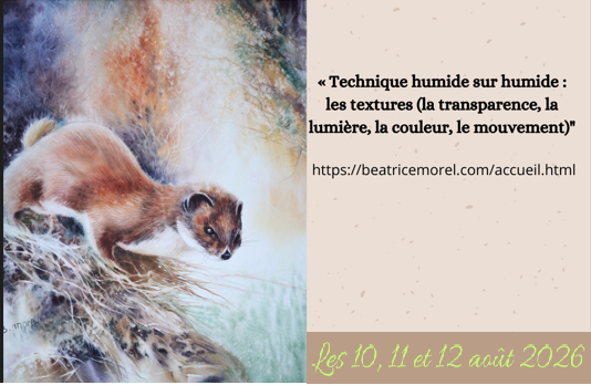 Invitée d’honneur du salon 2015, diplômée de l’Ecole Nationale des Arts Appliqués et des Métiers d’Art, auteur du livre « l’eau virtuose » animera un stage les 10, 11 et 12 août 2026 avec pour thème : « Technique humide sur humide : les textures (la transparence, la lumière, la couleur, le mouvement) »; Ce stage s’adresse aussi bien aux débutants qu’aux artistes qui veulent perfectionner leur technique prix du stage 220 € (110 € à l’inscription)